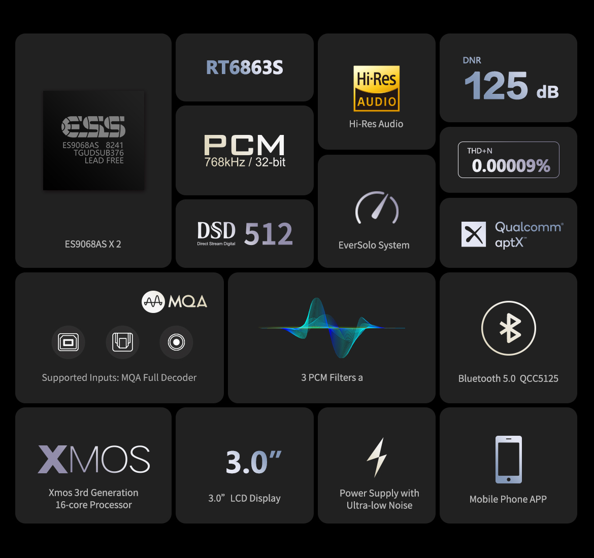 | THD+N (No-weighting) | 0.00031% @ 1kHz (–110dB) |