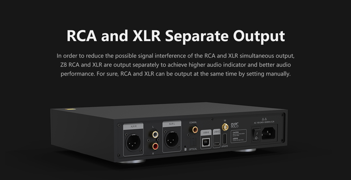 | Analog Audio Output | Preamp output: XLR (balanced), RCA; Headphone amp output: 6.35mm single-ended |