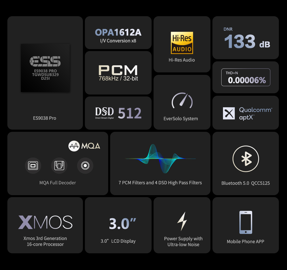 Up to DSD512 Native, PCM768KHz@32Bit decoding.