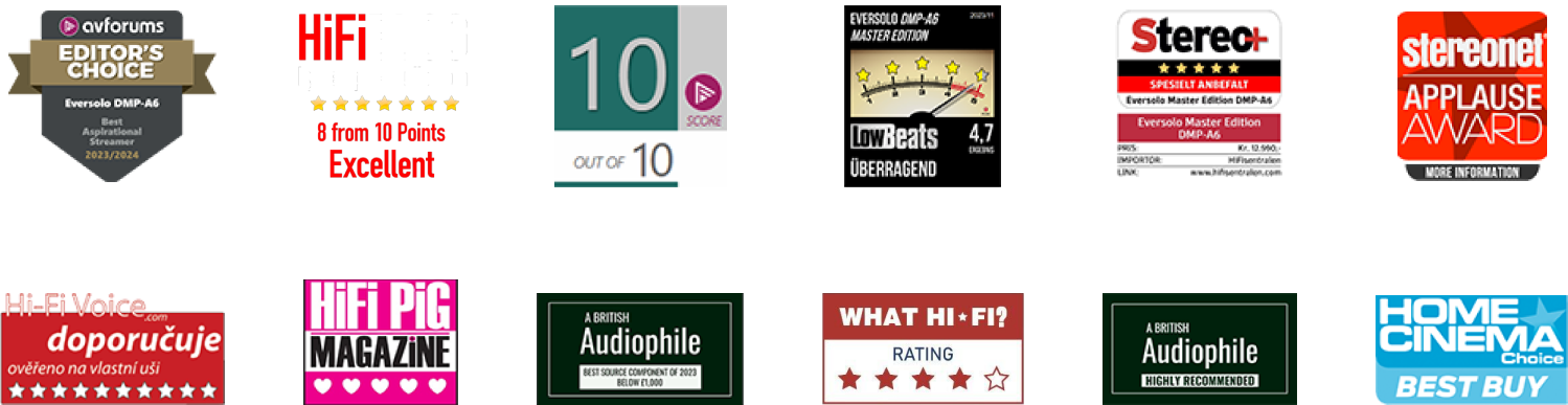 The product images, videos, and screen content on the above pages are for illustrative purposes only. The actual product appearance and screen display content (including but not limited to background, UI, illustrations, and videos) may vary slightly. Please refer to the actual product. The data on the above pages are theoretical values, obtained from Eversolo Labs under specific testing conditions. Actual usage may vary slightly due to individual product differences, software versions, usage conditions, and environmental factors. Please refer to actual usage.
